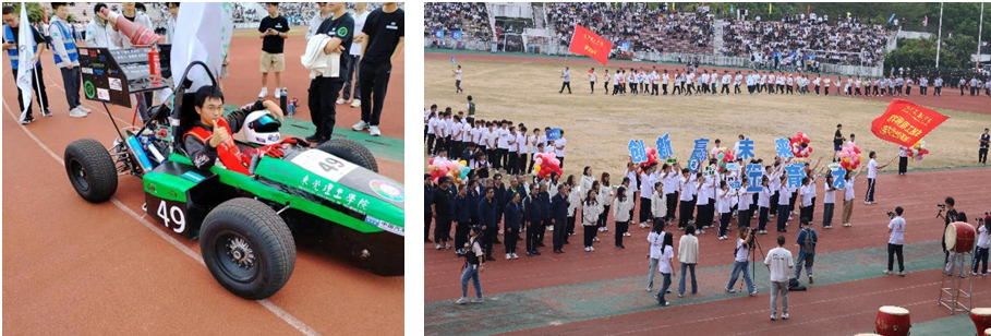 在本次运动会开幕式上,各学院方针入场仪式精彩纷呈,尤其在我院方程式赛车表演时,瞬间点燃了现场热烈的气氛。这辆名为“莞01”的赛车是在我院陈自豪、吕杰融两位老师的指导下,由莞工方程式车队的学生们亲手打造并驾驶的,它是“2024中国大学生方程式汽车大赛”获奖作品。