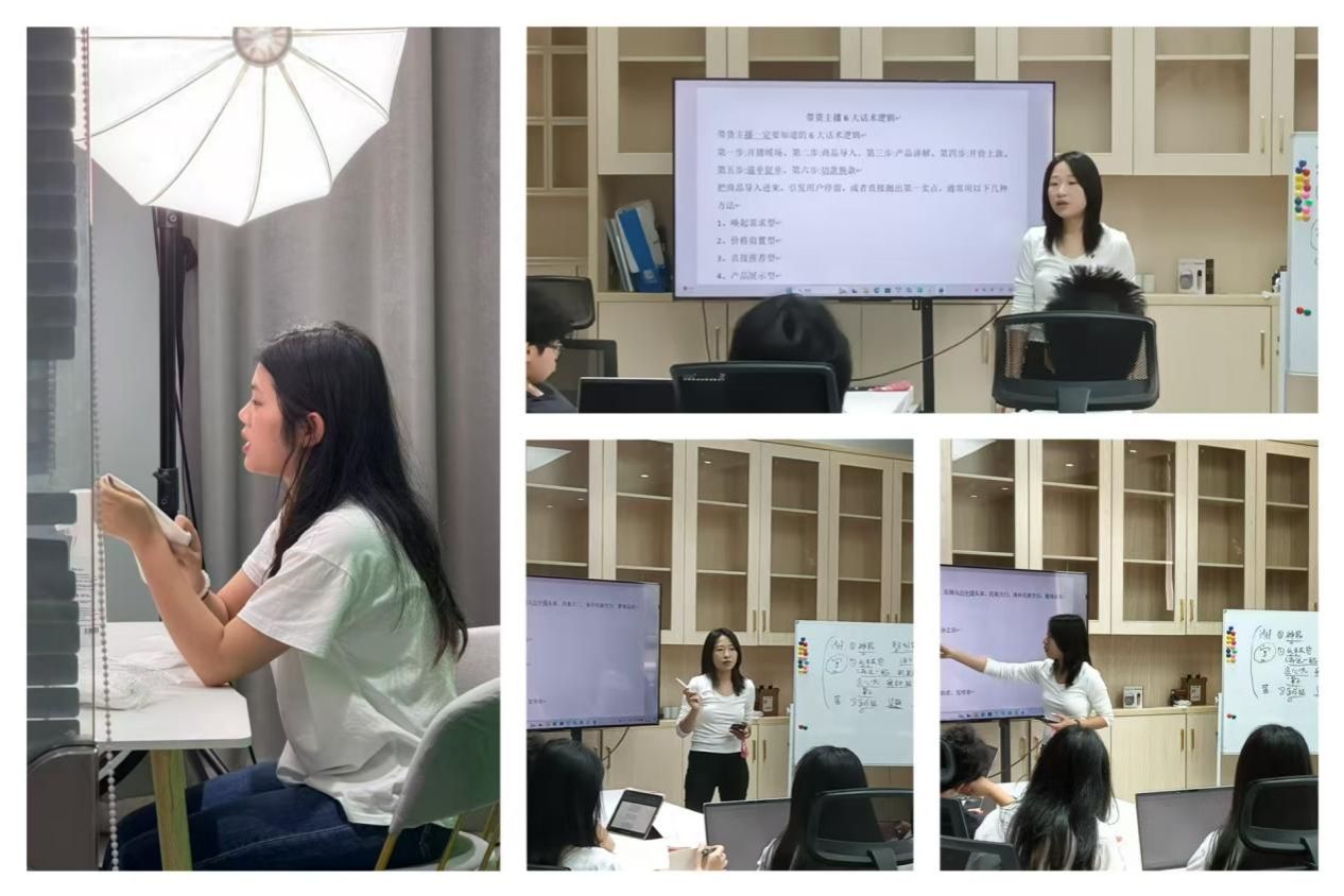 在混编实战与综合复盘环节,学员们打破校际界限,混编为六支战队,依次进入“直播间实操区”与“选品区”,完整演练从策划、选品、脚本撰写到现场直播的全流程。在模拟真实电商环境中,各组学员分工协作,主播展现话术与状态调控能力,中控熟练操作设备并配合节奏,运营人员实时监控数据并调整策略。导师团队全程跟踪,现场指导话术表达、镜头表现与团队配合,并在每次模拟直播后设置集中复盘环节,引导学员整理数据、总结经验、优化流程。