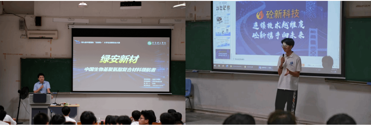 之后,由学校双创项目团队绿安新材负责人彭勃同学和砼新科技负责人宋昊宇同学作分享,以赛事项目路演的形式直观地向同学们进行展示,并就创新创业项目进行了经验交流。