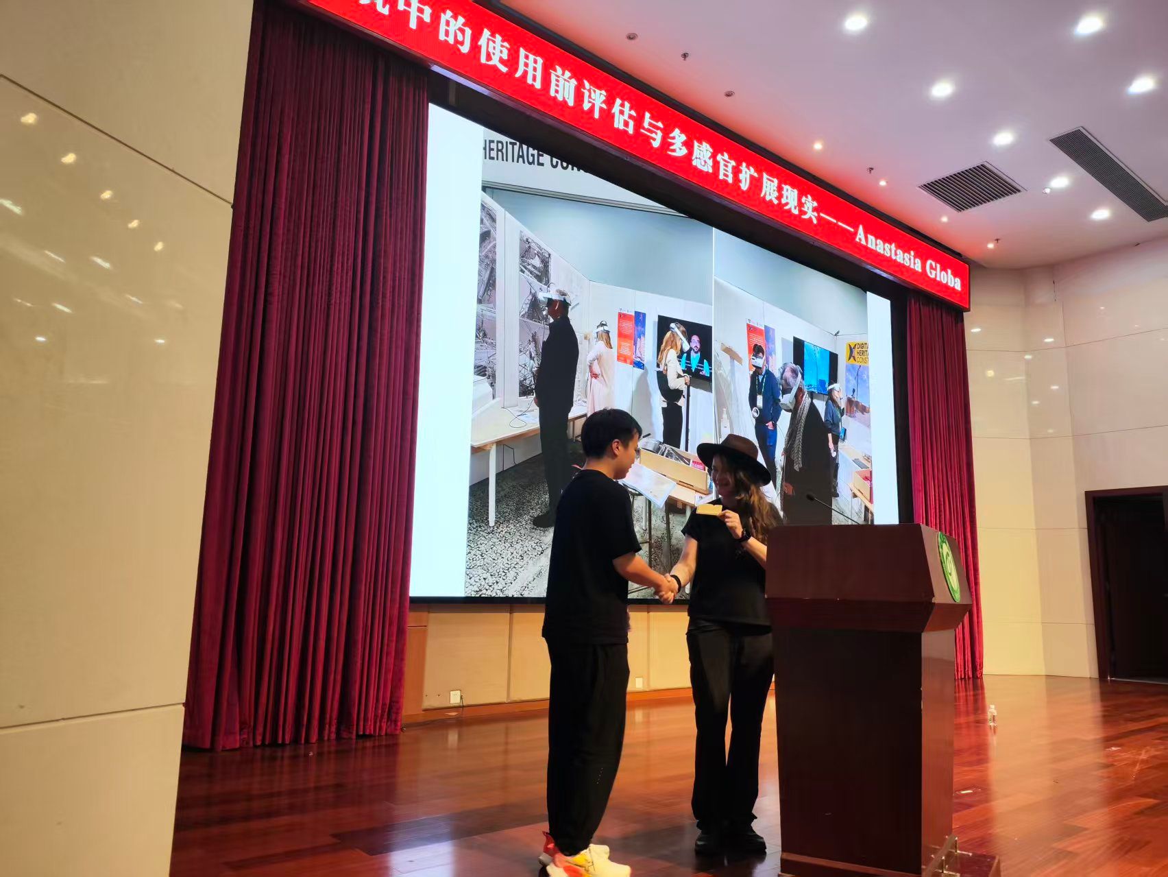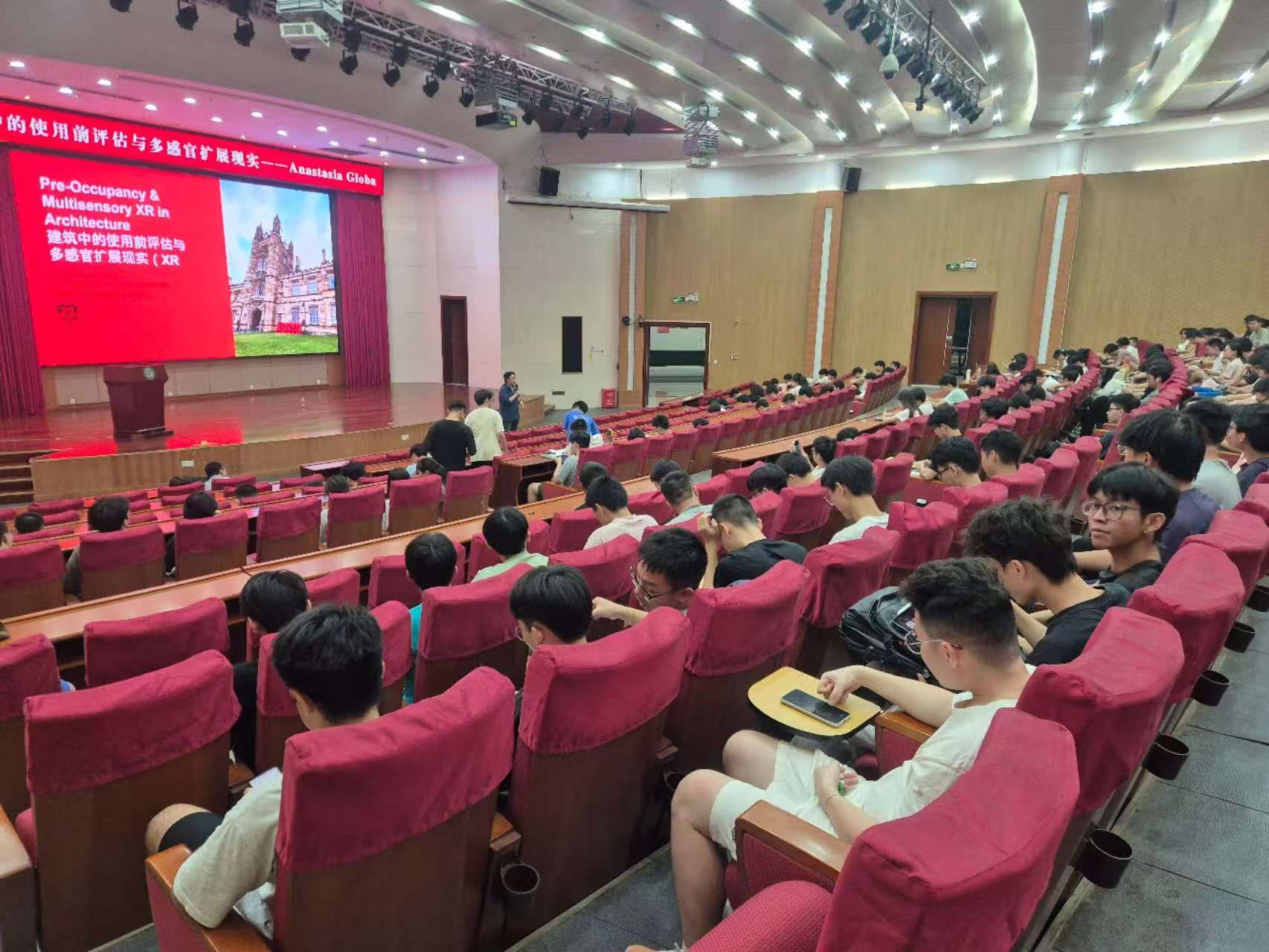 在学术会议中心报告厅,Globa博士作了题为“建筑中的使用前评估与多感官扩展现实”的学术讲座。她系统介绍了沉浸式技术、多感官模拟(XR)、生物材料及可持续性在建筑设计中的融合应用,并分享了基于VR/AR环境的设计探索、数据可视化及入住前模拟等项目案例。讲座拓宽了同学们对XR技术在计算分析、实时交互、沉浸式仿真等领域应用的认识。互动环节中,多位学生踊跃以英文提问,就XR具体应用及个人研究困惑与Globa博士深入交流。Globa博士对学生们的热情给予高度赞赏,并向学生代表赠送纪念品。